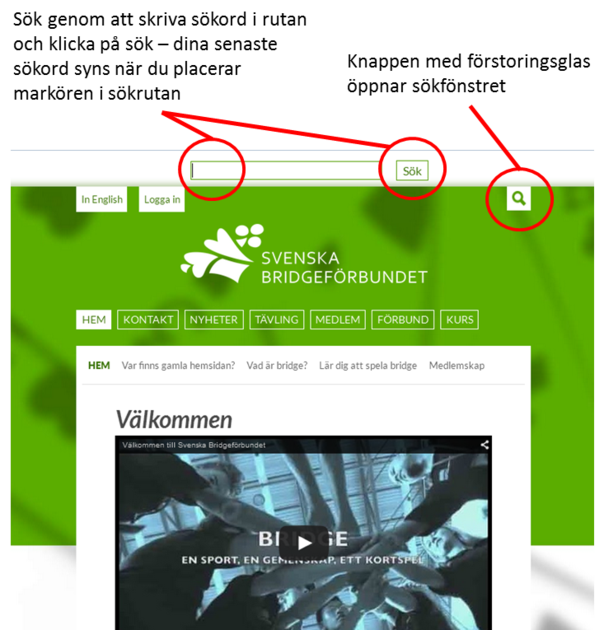 Knappen med förstoringsglaset uppe i högra hörnet öppnar ett sökfönster högst upp på sidan. Sök genom att skriva sökord i rutan och klicka på sök. Dina senaste sökord syns när du placerar markören i sökrutan.