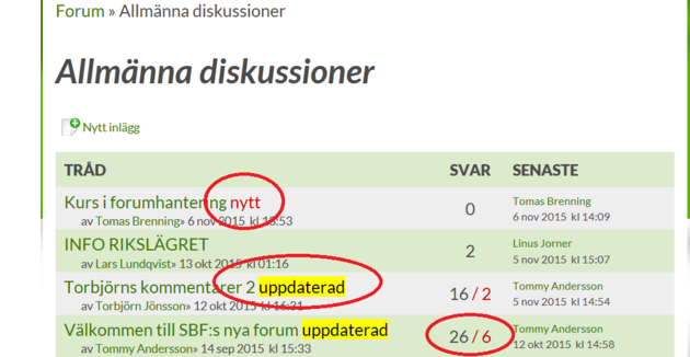 När du klickar på en tråd i listan kommer du till det ursprungliga inlägget. Om du däremot klickar på den röda markeringen i SVAR-kolumnen, då kommer du till de nya svaren.