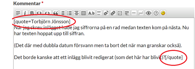 Att citera är detsamma som att svara, men du får föregående skribents text inflikad i ditt svar. quote-markeringarna visar var citatet börjar och slutar.