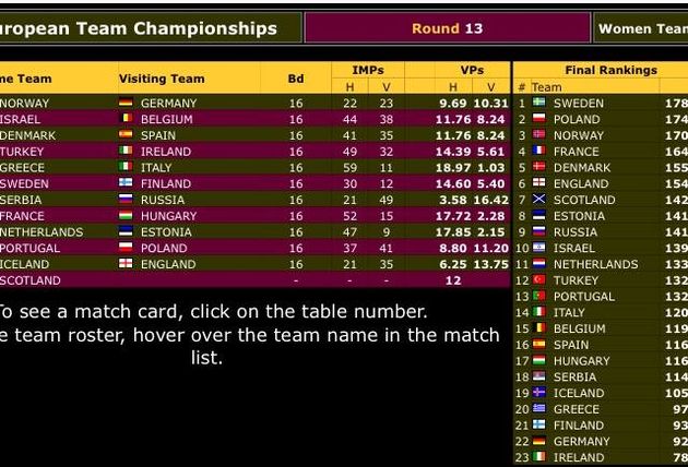 Veteranerna hade en bättre dag och tog igen lite av det vi förlorade igår. 16,46 mot Italien, 18,97 mot Finland och 7,20 mot Bulgarien gav 42,63 och vi ligger nu på 4:e plats med knappa 14 vp upp till bronset.