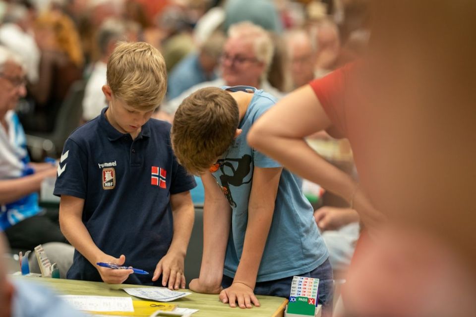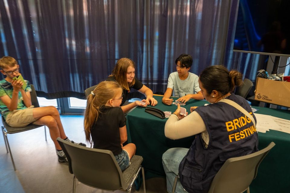 Framtidens världsstjärnor? Amelie, Elias och Vincent spelar bridge med juniorkoordinatorn Paulina medan Per chillar i bakgrunden med budträningsappen Cuebids.