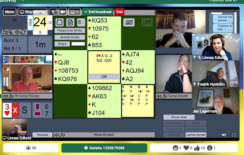 Som mest var vi uppe i 70 tittare under kvällen på videosändningen, och uppåt hundra på Kibitz-länken där man kunde följa brickorna med fördröjning.