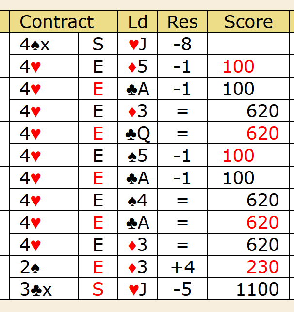 Visst missnöje uppstår hos motståndarna och spelaren som bjöd 2S säger att hon inte såg alerten på 1kl. Proffset tar då dit TL som efter överläggning gör en bokstavstolkning av reglerna och dömer split score 50% 4H med hemgång och 50% 4H med bet. Enligt butlern spelades 4H 15 gånger med hemgång i 10.
