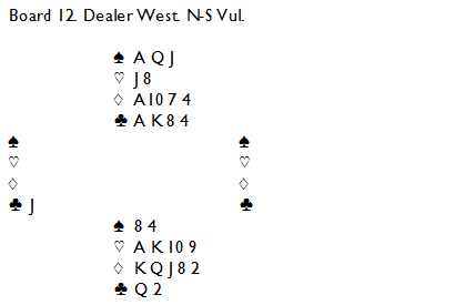 Åt middag med Tom Gärds igår, han berättade om en intressant giv han noterat som jag också skrivit om i bulletinen till imorgon. Du är i sju ruter och ser ovanstående då Väst spelar ut klöverknekt.