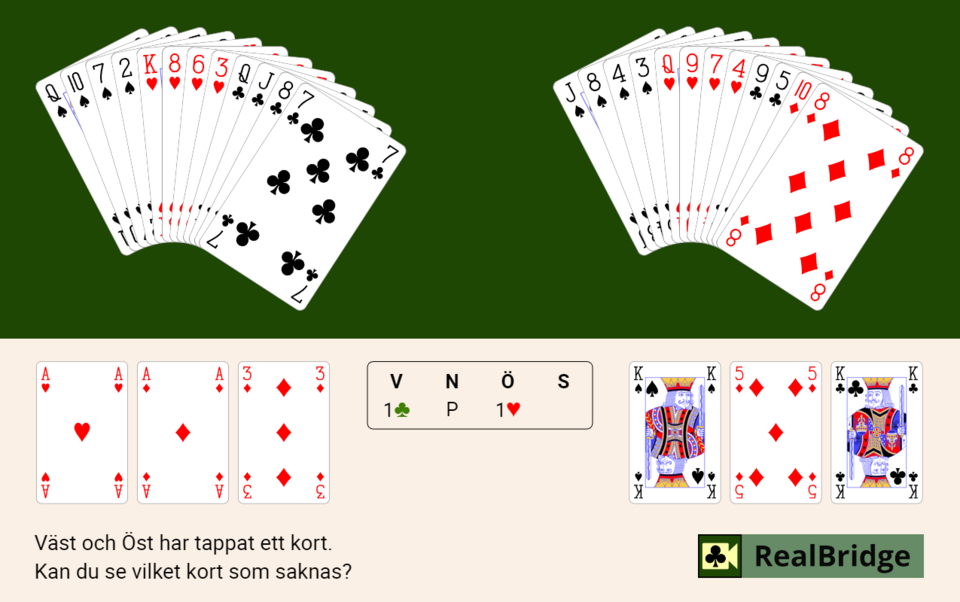 Väst som bara har åtta hp öppnade med 1 klöver. Något av essen behövs därför för att få ihop tillräckligt med poäng för att öppna. Vilket ess är det som saknas? Hjärteress kan det inte vara, eftersom Väst med femkorts hjärter öppnat med 1 hjärter istället för 1 klöver. Väst saknar alltså ruteress.