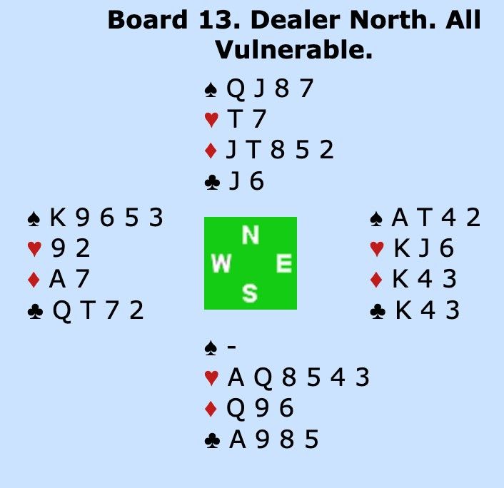De flesta andra bord hade spelat 4♠ med ett par straff. I en annan match, England mot Danmark, spelades 3NT men där gick man fyra straff. Det var lite kul efter att vi förlorat ett domslut mot just Danmark. (Ett icke-samspelt par hade en budgivning där man förklarade ett bud på ena sida enligt vad man hade bjudit det som, och på andra sidan förklarades det korrekt som ingen överenskommelse. Den spelare som hade fått veta vad man faktiskt hade valde ett väldigt spekulativt bud, varpå dennes partner valde ytterligare ett dåligt bud, varefter man gick för 800 mot normala 450.