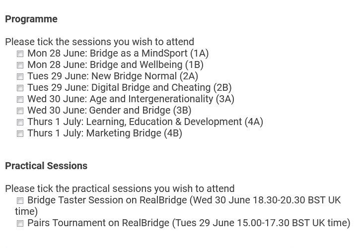 Alla perspektiv på bridge – det goda, det dåliga och det nyskapande - tas upp vid en fyra dagar lång virtuell konferens 28 juni - 1 juli anordnad av Bridge: A MindSport for All (BAMSA). Hela 60 talare från 20 olika länder finns med för presentationer och diskussioner.