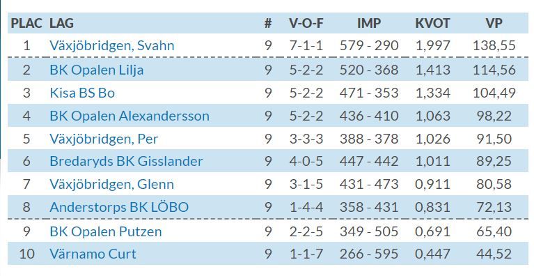 Nu är Allsvenskan div.III färdigspelad och vi gratulerar lag Växjöbridgen Svahn som vann serien.