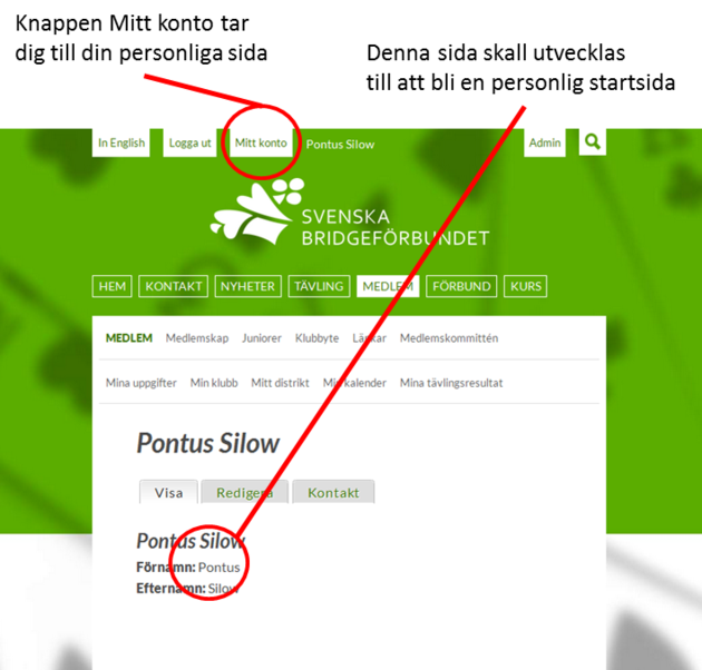 Knappen ”Mitt konto” tar dig till ”Medlem” och din personliga startsida, men den sidan är ännu ej utvecklad.