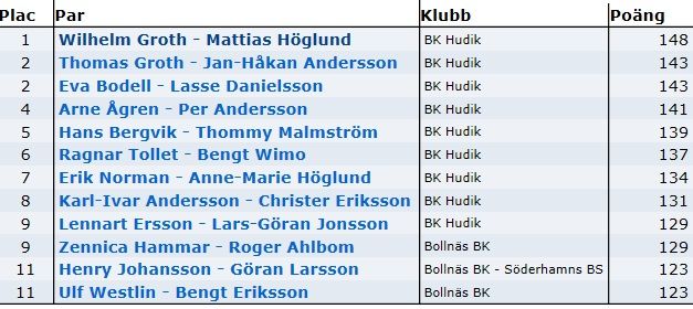 12 par en tisdag var det ett bra tag sen, så extra kul igår. Gästerna fick på nöten i en annars jämn tävling där Wilhelm och Mattias vann på 54,8% . Andraplatsen delades mellan Eva / Lasse och Janken / Thomas.