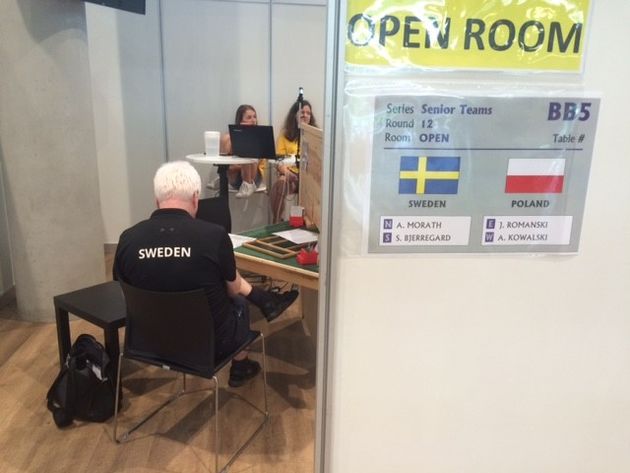 Alibimannen fick med sig 4,81 mot Sverige. Det såg lite annorlunda och betydligt jämnare ut för oss som följde running scores. Inte ett enda resultat stämde med de officiella scorerna när lagen jämförde. Det visade sig att de hade blandat ihop bridgematen så att bordet bredvid hade fått det svenska lagets scorer. De var glada och tyckte förvånande nog att de ville behålla våra resultat, de var ju så mycket bättre än deras egna, men vi fick tillbaka dem och och kunde vinna matchen med betryggande marginal.