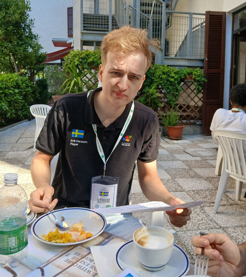 Jag själv satt och tog en San Pellegrino på en närliggande bar med Fredrik Nyström som mestadels har uppgiften att vara barnvakt här nere. När det var 3 brickor kvar så låg vi under med 36 IMP och jag som är nördig nog att kolla korten snabbt samt dubbel-dummy-analysen insåg att det är kört. Jag och Nyström rör oss oerhört långsamt till Palazzio dei congrezzi med hängande och besvikna huvuden för att sörja med våra U26:or. Väl framme vid spellokalen så får vi höra att laget hade förlorat på ”tie-break” eftersom vi förlorade mot Polen både i round-robin och inbördes. Som coach blir jag väldigt besvikne och ledsen över detta resultat eftersom ett endaste j*vla övertrick hade räckt till avancemang. Jag går en bit bort och ser/hör hur Nyström snackar med Sanna/Alex om någon bricka där Polackerna har förklarat ett bud som varit oerhört(!!!) dåligt beskrivet enligt deklarationen. Två minuter senare ser jag hur Fryklund, Sanna och Alex ”springer” in i spellokalen och försöker allt de kan för att protestera mot polackernas deklarationskort och hur de tog ett ”obridgigt beslut” på grund av dålig förklaring av deklarationskortet.