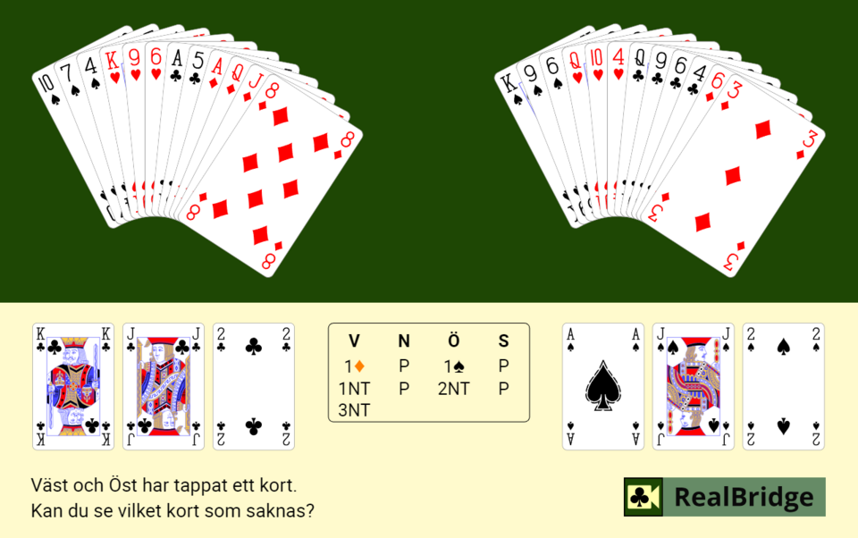 Öst: Svarsbudet 1 spader med tre kort går inte för sig, men vilken spader saknar Öst? Öst har inviterat till utgång, något som inte kan göras med de 7 hp som Öst har. Därmed faller tvåan bort. Västs återbud 1NT visar 12-14 hp, så Öst behöver 11-12 hp för en invit. Skulle Öst ges spaderknekt får han 8 hp. Får Öst istället spaderess räknar vi till 11 hp. Det är således spaderess Öst saknar.