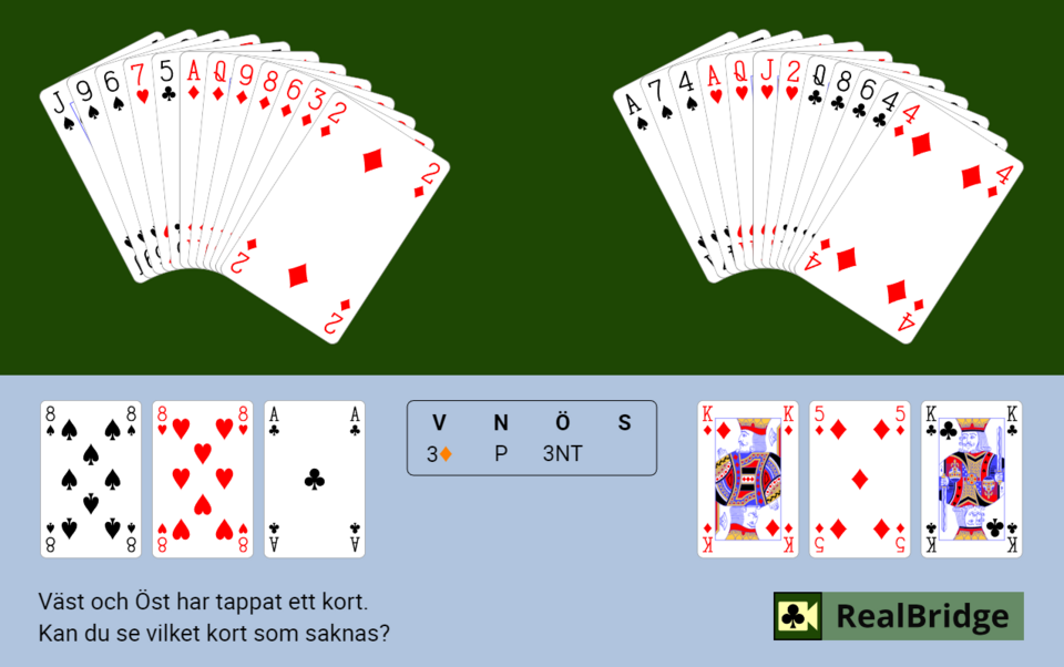 Öst: Eftersom Väst kan ha så lite som 6 hp räcker inte Östs nuvarande 13 hp till att bjuda 3NT. Öst saknar därmed någon av lågfärgskungarna, men vilken? Ges Öst klöverkung räknar vi till 16 hp, men i värsta fall har paret då bara 22 hp ihop. För att ta en chans på 3NT bör Öst ha viss anpassning i den färg Väst spärröppnat. Med ruterkung får Öst goda förhoppningar om att utgången kommer att ordna sig med sju ruterstick, de två högfärgsessen och en någorlunda broms för klöverattack. Öst saknar således ruterkung.