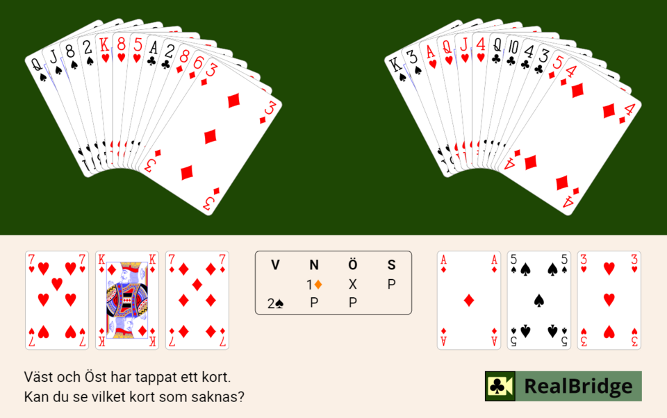 Väst: Öst upplysningsdubbling (UD) tvingar Väst att bjuda. Även med 0 hp hade Väst varit tvungen att bjuda något, så ett hopp till 2 spader lovar ungefär 8-10 hp. Ruterkung kan inte vara kortet Väst saknar, eftersom Väst då blir för stark för 2 spader. Är hjärtersju då det saknade kortet? Nej, för med 4-4 skulle Väst kunna bjuda 2 hjärter (och mer avancerade kanske försöka utröna vilken fyrkorts högfärg Öst har).