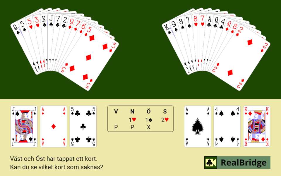 Öst: För att kliva in med 1 spader över Nords hjärteröppning behöver Öst fem spader, så ruterkung kan inte vara det saknade kortet. Såväl spaderess som spaderfyra passar in på Östs första bud, inklivet 1 spader. Svaret på vilket kort Öst saknar återfinns i den andra budronden. Efter det att Syd stöttat öppningen till 2 hjärter väljer Öst att hålla budgivningen vid liv med en dubbling. Med spaderfyra på handen finns inte mer att tillägga, då inklivet 1 spader redan berättat hela historien. För att få kraft till ytterligare bud behöver Öst en något starkare hand – och därmed är det kort Öst saknar spaderess.