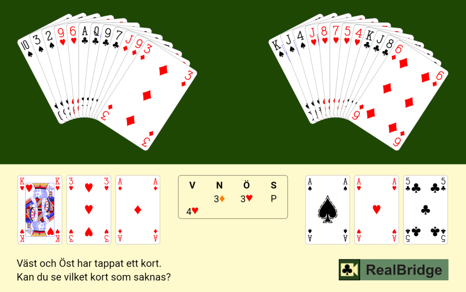 Öst: Efter en spärröppning kan man ibland få tänja sig lite för att vara med i budgivningen, men att kliva in med bara 9 hp och dålig färg räcker för de flesta inte ens till ett enfärgsinkliv. Öst behöver alltså en bättre färg och fler poäng för ett inkliv på treläget. Det kan han få med ett och samma kort, så hjärteress är det kort Öst saknar.