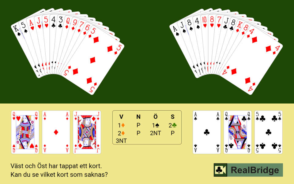 Väst: Här har Väst öppnat budgivningen, bjudit om ruterfärgen och sedan accepterat en invit till 3NT. Det rimmar dåligt med bara 10 hp och fem kort i ruter. Öst har lovat ca 11 hp och för att acceptera sanginviten behöver Väst åtminstone 14 hp. Därmed är det ruteress Väst saknar.