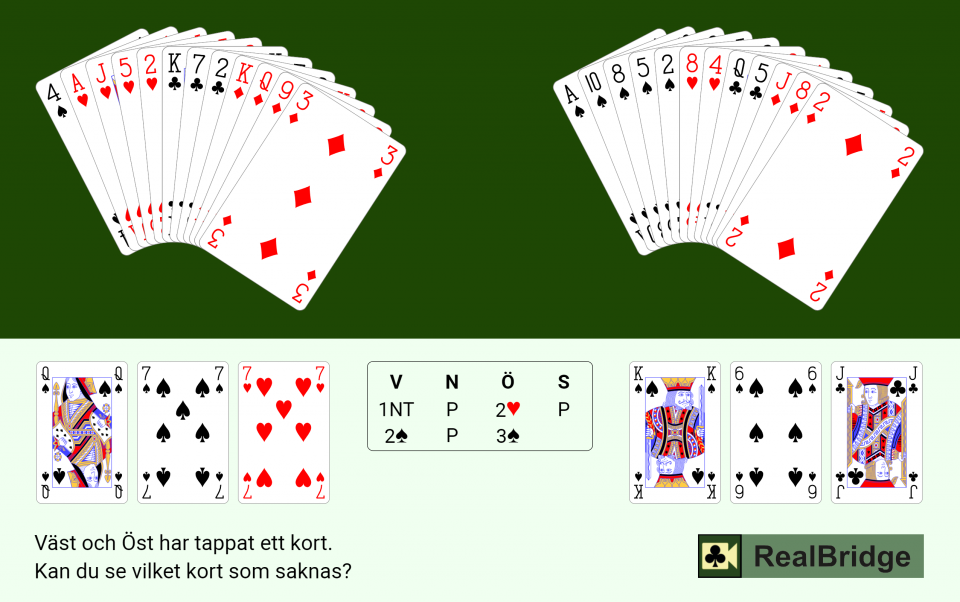 Väst: Att inleda budgivningen med 1NT och ha singelspader duger inte, så här saknar Väst en spader och vi kan direkt avfärda hjärtersju som saknat kort. Är det då spaderdam eller spadersju som Väst saknar? Lösningen finns tillgänglig genom att räkna Västs poäng. De flesta lovar 15-17 hp för sin sangöppning. Här har Väst endast 13 hp, varför spaderdam är det kort Väst saknar.