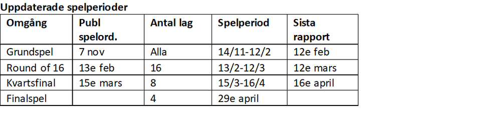 Grundspelet i MBC kommer att förlängas till den 12e februari, då det är en del lag som inte hunnit få till sina matcher ännu. Följande omgångar kommer att justeras efter detta. Vi har valt att förlänga då det främst är tänkt att denna turnering ska vara en rolig ingång till bridge, och då är det viktigast att alla får möjlighet att spela sina matcher!