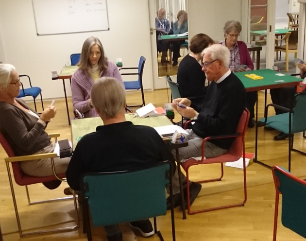 I höst genomför vi parallellt 3 olika kurser varje onsdagskväll, här ser vi nybörjarna försöka tränga in i bridgens mysterier.