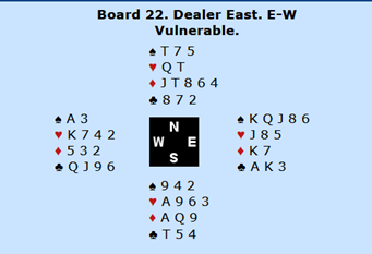 Dagens bricka får väl anses väga upp bricka 29 från match 8 när vi fick 3NT på den starka handen, vilket var fel när det då naturliga utspelet betade 3NT medan de som fick 3NT på den andra handen gick hem. Återigen var det få (4 par) som lyckades hitta den förlovade 5-2:an i spader och notera hemgång…