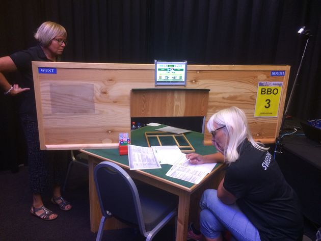 Det finns en del fans på plats. I dag har Brita och Hans Bergman från Stockholm anslutit och suttit med vid borden för att följa spelet live. Brita bakom Maria Grönkvist och Hans bakom Fredrik Nyström. Brita och Hans var på plats i Malmö när damerna vann EM 2004, kan det vara ett tecken? Det är alltid trevligt med supporters!