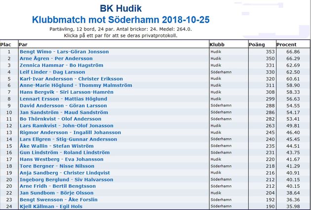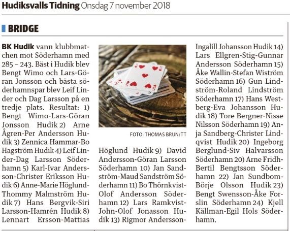 12 par från vardera Söderhamn och Hudik möttes i en klubbmatch i Hudiksvall. Inte ofta nu för tiden att vi i Hudiksvall tycker lokalen är för trång, från fem par i tisdags till 24 par i klubbmatchen.