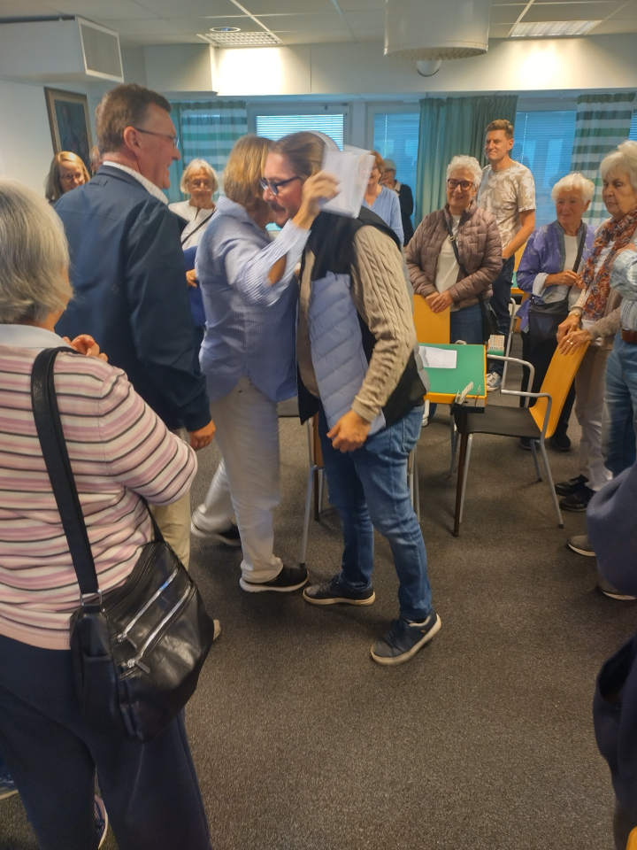 På bilden ser vi när Calle Ek får en kram av Gunnel Montgomery.