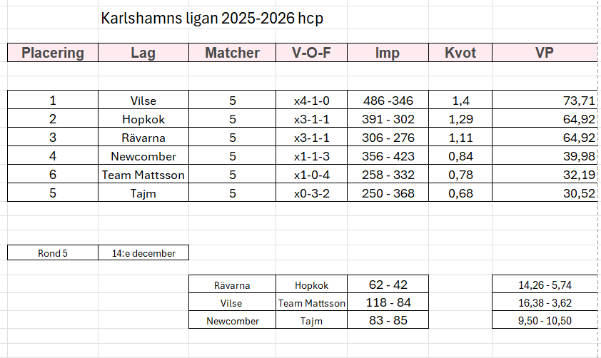 Karlshamnsligans femte rond av tio är nu spelad och ny ledare är lag Vilse. Lag Newcomber gjorde en bra match och spelade oavgjort mot lag Tajm. Ligan gör nu paus över helgerna och rond sex spelas den 11 januari.