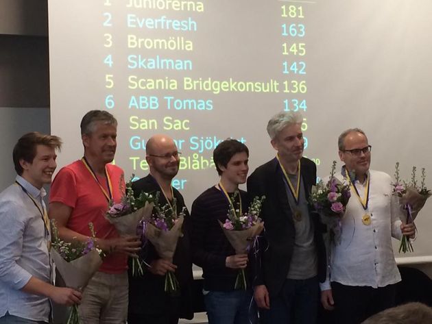 När Väst dristade sig till ett inkliv på femläget borde kanske Öst ha resonerat på samma sätt som vid andra bordet och lagt på till slam. Han var dock i gott sällskap eftersom flera av de andra spelarna med samma läge också valde ett pass. Två par kom faktiskt inte ens i utgång vilket förstås var ett ännu sämre resultat. 11 imp till Bromölla men i och med vinsten i matchen säkrade Juniorerna vinsten med en match kvar trots att man skulle möta tvåan Everfresh i sista matchen och där alltså spela om dubbla poäng. Segerpoängen stannade till slut på 181 VP, inte lika högt som rekordnoteringen från 2001 (193 VP) men högre än vid Skalmans storseger 2013 på 179 då tre av årets vinnare fanns med i laget.