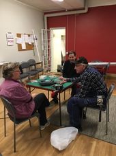Inte mindre än 17 pers var vi, som på olika sätt jobbade under dagen. Det var framförallt spelsal 2 som fräschades upp + att många stolar blev omklädda. När kvällen kom smakade det gott med mat. Då var vi endast 12 som var kvar. Trots att alla var trötta orkade vi spela en partävling med 15 brickor.