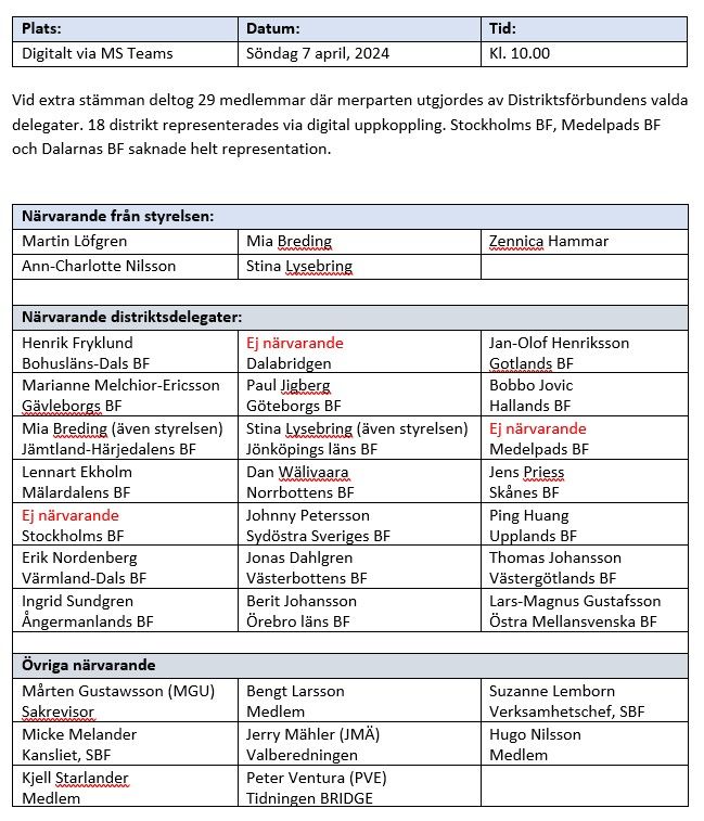 Micke Melander, SBF Kansli, redogjorde för hur en hemställan som första åtgärd blivit skickad till samtliga distrikt för godkännande om att beslut om stadgeändringar skulle få fattas på en extra stämma. Samtliga distrikt godkände denna hemställan, som också redovisats i handlingarna. Extra stämman har därefter blivit utlyst per den 21 mars, 2024. Kallelse och samtliga handlingar har sedan detta datum funnits publicerade på förbundets hemsida.