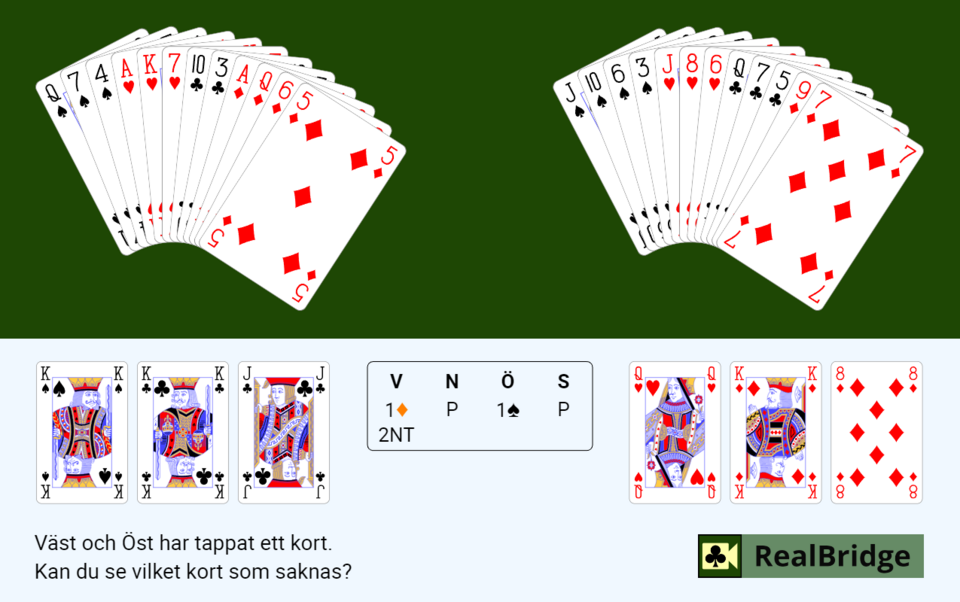 Öst: Öst har bara 4 hp, med 5 eller färre bör man passa som svarshand. Nu bjuder Öst aktivt 1 spader vilket indikerar 6+ hp. Sålunda måste Öst ha ruterkung eller hjärterdam. OM Öst hade haft 4-4 i högfärgerna hade Öst återbjudit 1 hjärter och inte som i exemplet en spader. Sålunda har Öst 7 hp och ruterkung.